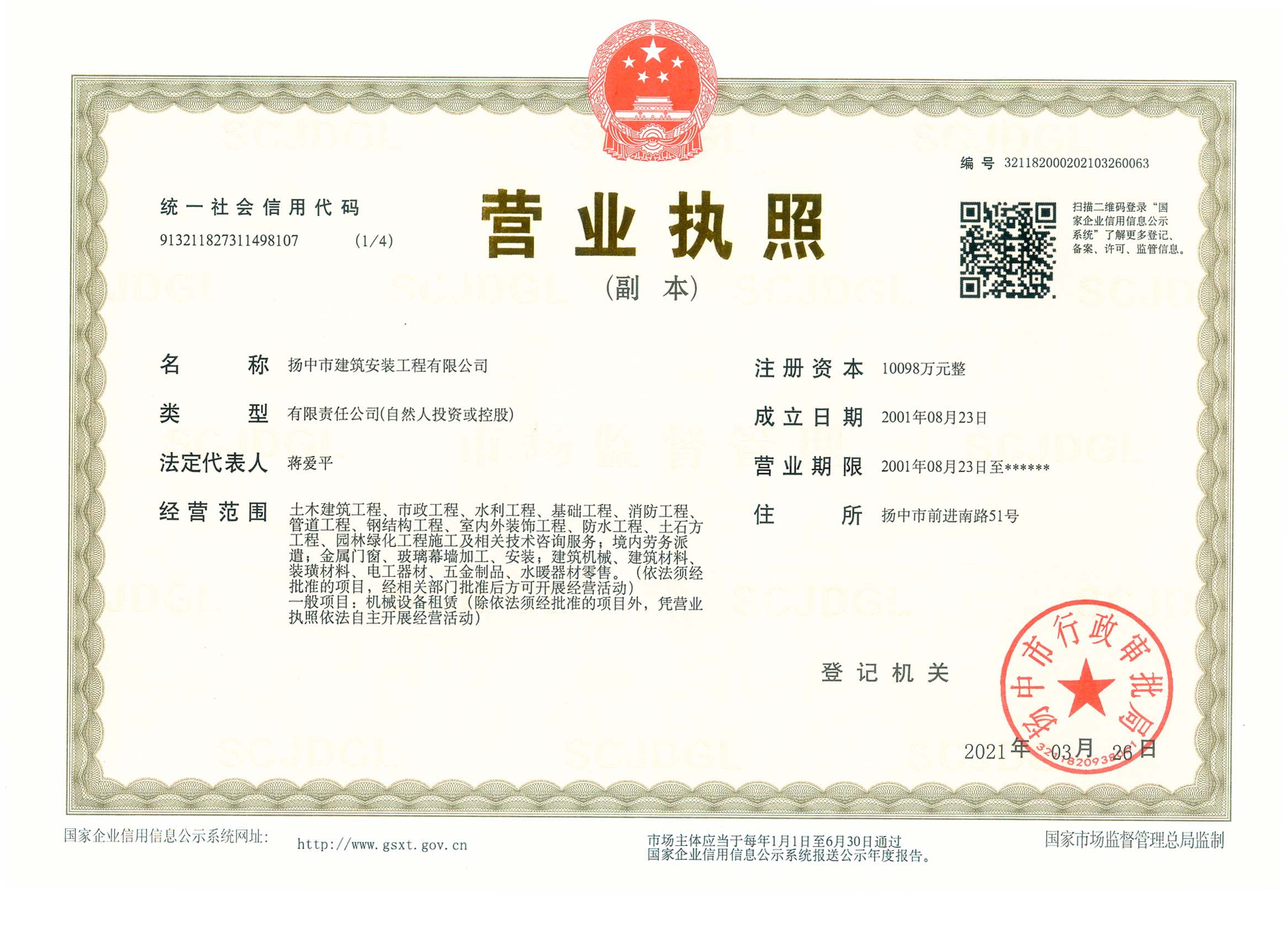 揚(yáng)中市建筑安裝工程有限公司是房屋建筑工程施工總承包國(guó)家一級(jí)和市政公用工程施工總承包國(guó)家一級(jí)資質(zhì)施工企業(yè),并具有地基基礎(chǔ)工程專業(yè)承包、起重設(shè)備安裝工程專業(yè)承包、建筑裝修裝飾工程專業(yè)承包、消防設(shè)施工程專業(yè)承包、建筑機(jī)電安裝工程專業(yè)承包、鋼結(jié)構(gòu)工程專業(yè)承包等資質(zhì),在上海、南京、鎮(zhèn)江、蘇州、常州、沭陽(yáng)、蕪湖、湖北襄陽(yáng)等地設(shè)有分公司。60多年來,公司承建了一大批工業(yè)與民用建筑,為地方經(jīng)濟(jì)和...